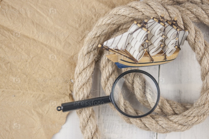 Пеньковая веревка, увеличительное стекло и модель классической лодки на фоне старого белого дерева