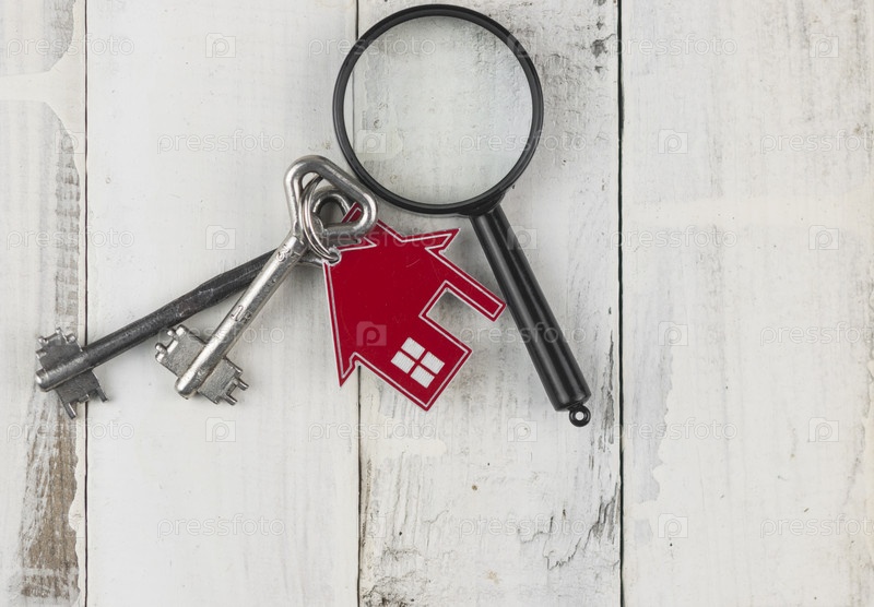 Металлический брелок в форме дома с металлическим ключом под увеличительным стеклом на фоне белой деревянной доски. Концепция недвижимости