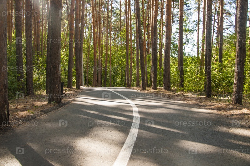 Велосипедная и беговая дорожка в летнем лесу. Белая дорожная разметка на асфальте
