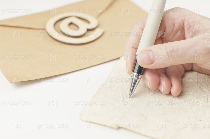 Женская рука с шариковой ручкой, пишущая на старом бумажном конверте, поздравительная открытка с днем рождения, личная записка или приглашение, поздравления с Рождеством, Пасхой и Новым годом. Концептуальное письмо по электронной почте