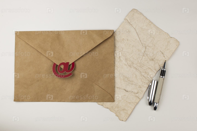 Знак электронной почты на коричневом конверте с чистым листом старой бумаги лежит на белом фоне. Концептуальное письмо по электронной почте