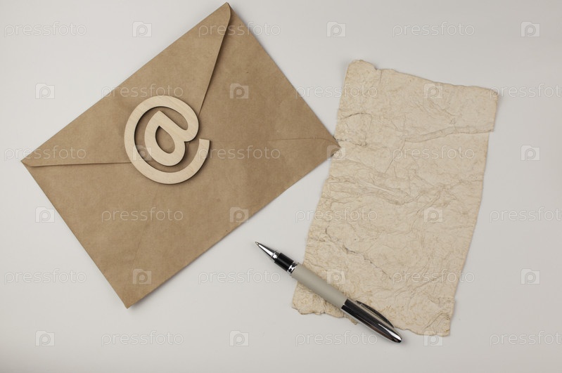 Знак электронной почты на коричневом конверте с чистым листом старой бумаги лежит на белом фоне. Концептуальное письмо по электронной почте