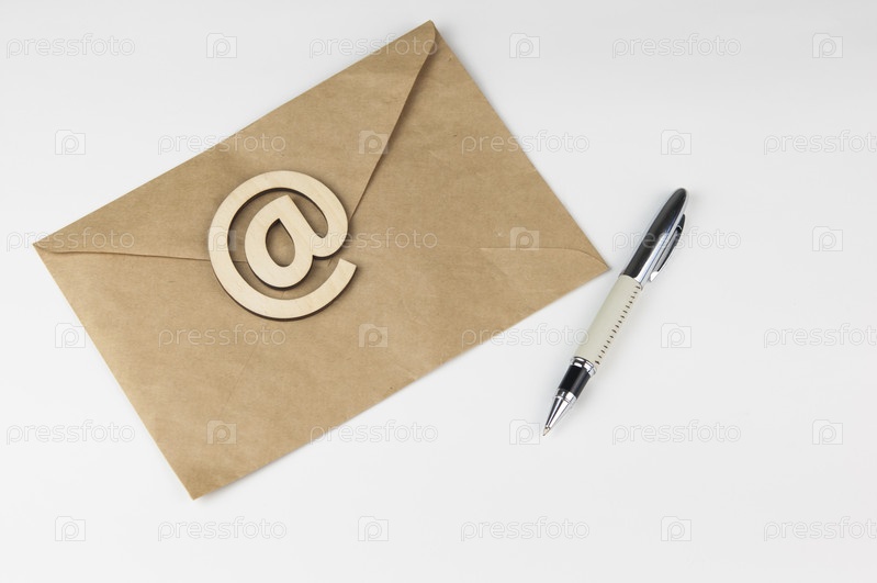 Конверт с ручкой и деревянным знаком Электронная почта лежит на белом фоне. Концептуальное письмо по электронной почте