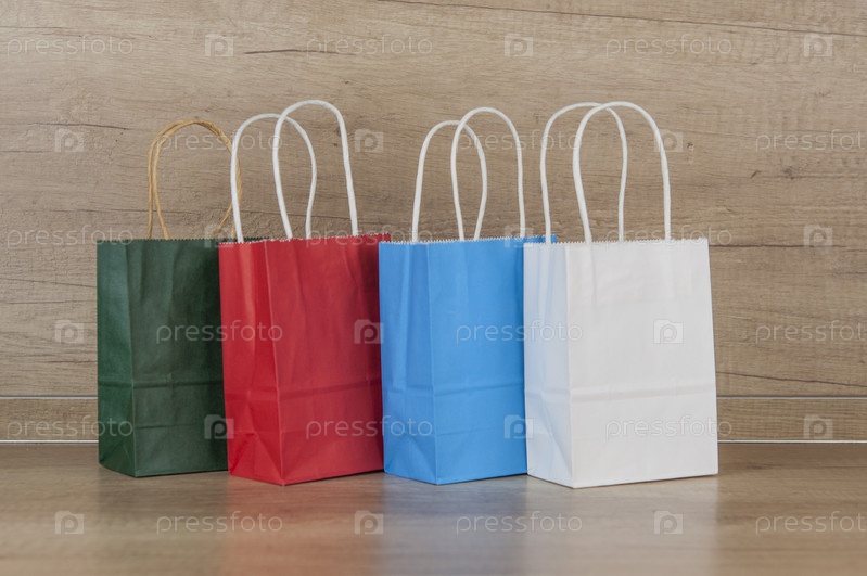 Красочные бумажные сумки для покупок на полу на фоне деревянной стены