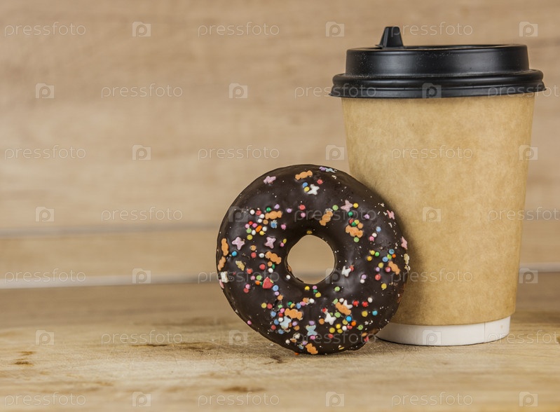 Шоколадный пончик или пончик с чашкой горячего свежего кофе или чая