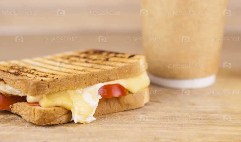 Большой бутерброд с ветчиной, сыром, помидорами и одноразовой кофейной чашкой на поджаренном хлебе