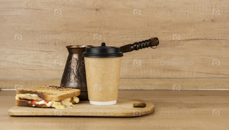 Большой бутерброд с ветчиной, сыром, помидорами и одноразовой кофейной чашкой на поджаренном хлебе