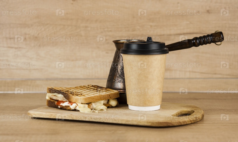 Большой бутерброд с ветчиной, сыром, помидорами и одноразовой кофейной чашкой на поджаренном хлебе