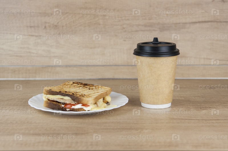 Большой бутерброд с ветчиной, сыром, помидорами и одноразовой кофейной чашкой на поджаренном хлебе