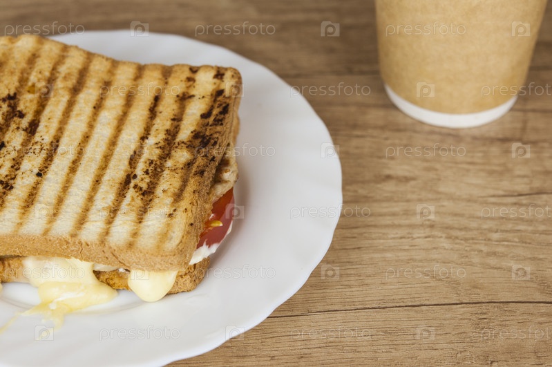Большой бутерброд с ветчиной, сыром, помидорами и одноразовой кофейной чашкой на поджаренном хлебе