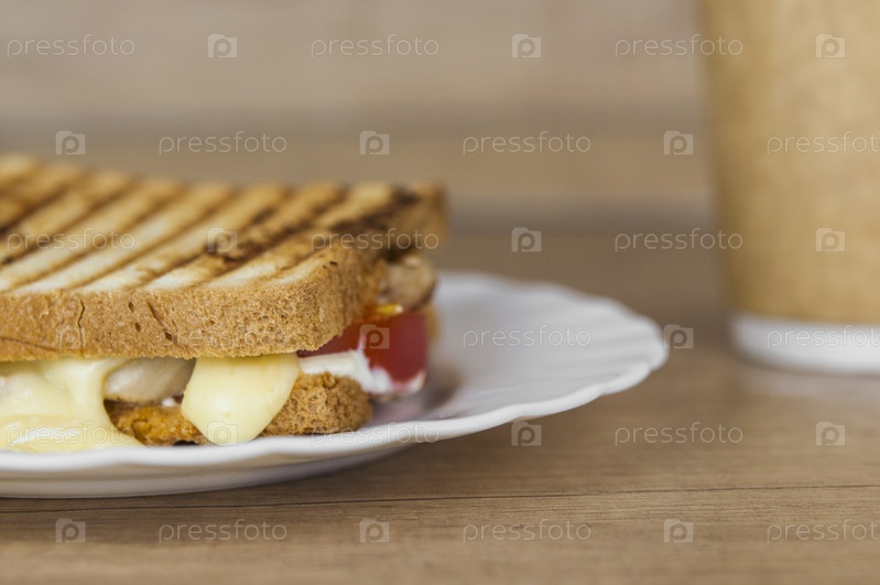 Большой бутерброд с ветчиной, сыром, помидорами и одноразовой кофейной чашкой на поджаренном хлебе