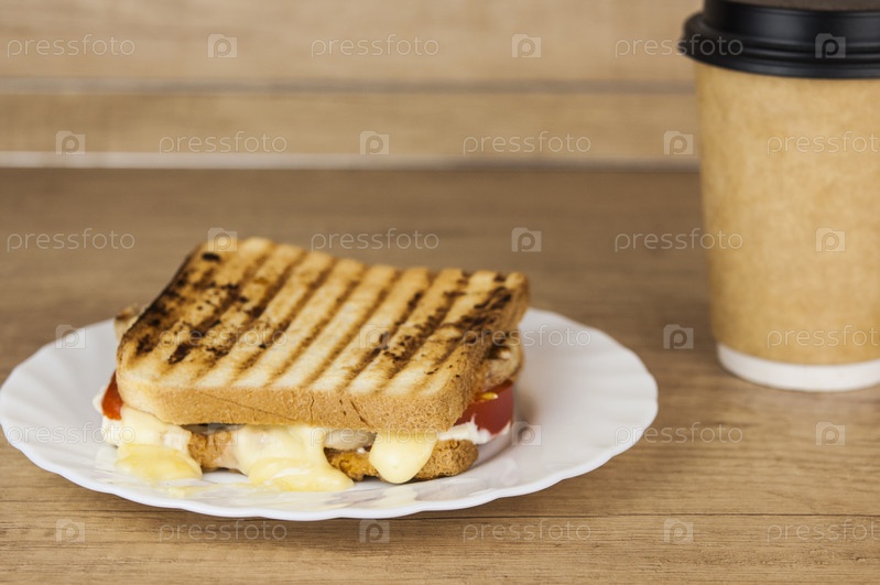 Большой бутерброд с ветчиной, сыром, помидорами и одноразовой кофейной чашкой на поджаренном хлебе