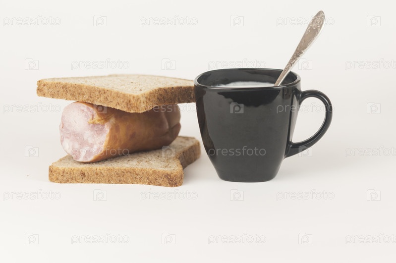 Бутерброд с колбасой на белом фоне. Завтрак, фаст-фуд