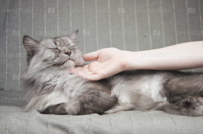 Рука ребенка гладит кошку по голове
