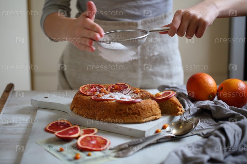 Девочка просеивает сахарную пудру через сито на апельсиновый пирог