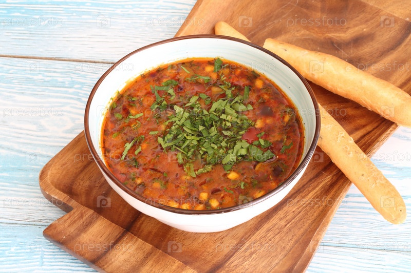 Суп с кукурузой и гриссини на деревянном подносе