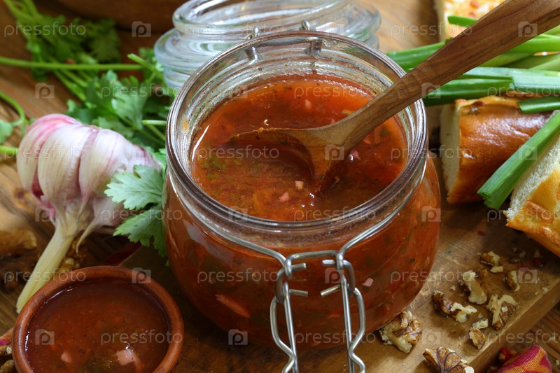 Грузинский соус ткемали на деревянном столе