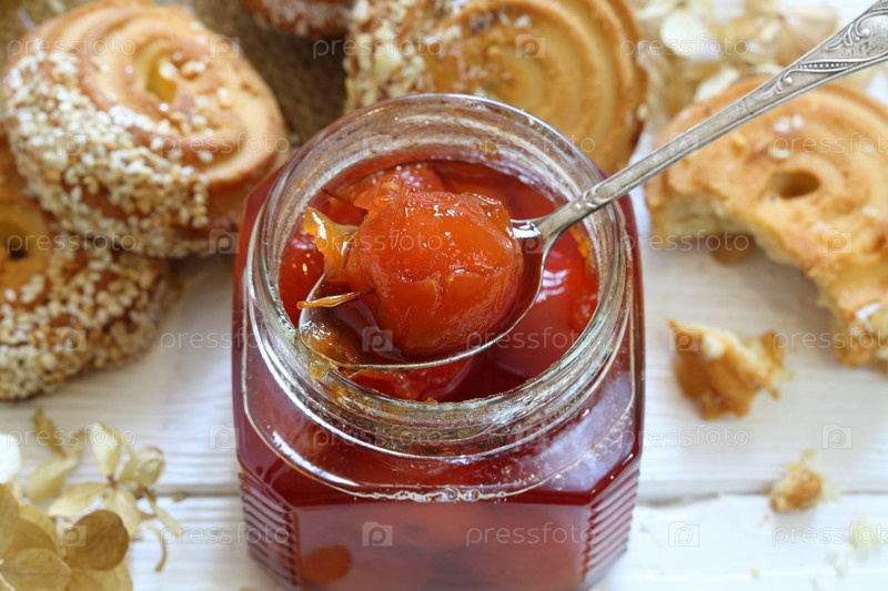 Варенье из райских яблок и печенье на белом фоне