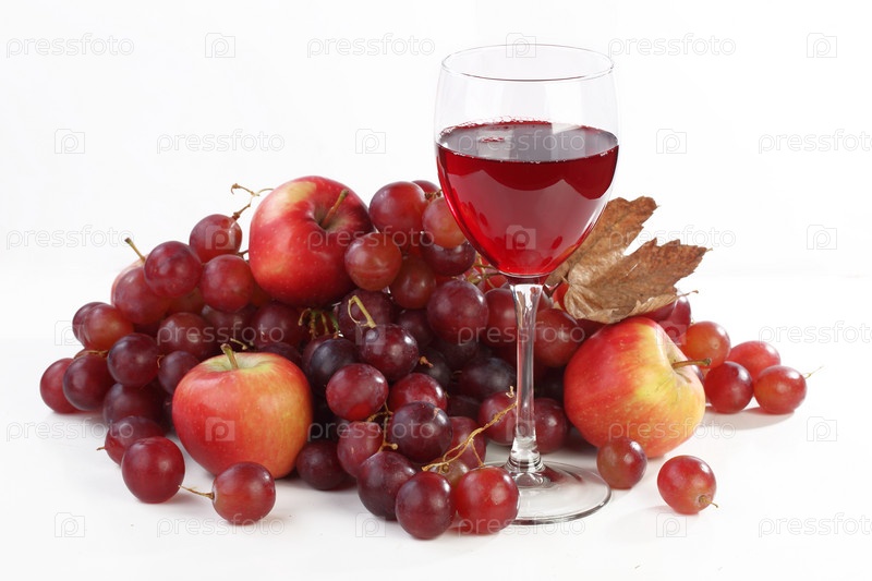 Натюрморт с вином и фруктами на белом фоне