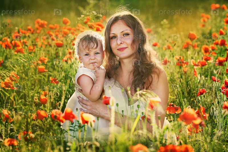 Молодая женщина с маленьким ребенком в пале с маками