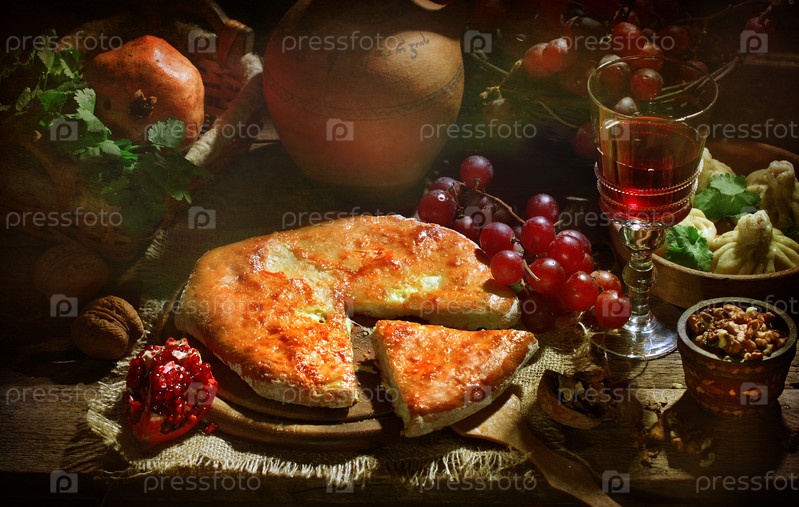 Натюрморт с хачапури,хинкали и красным вином