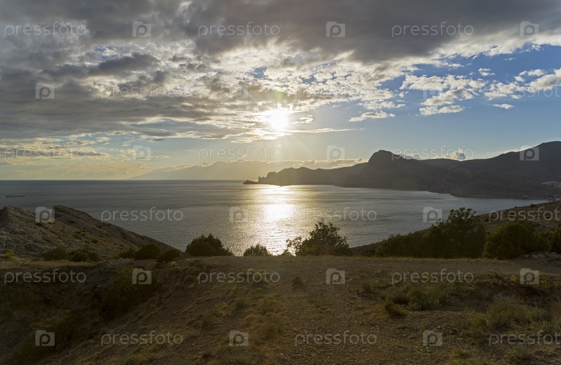 Вечернее солнце отражается в море. Вид с вершины мыса Алчак. Судак, Крым, сентябрь