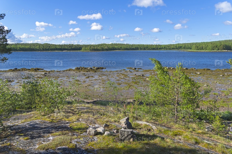 Литораль во время отлива. Берег Белого моря. Кандалакшский залив, Чупинская губа, остров Олений, Карелия, Россия, конец июня
