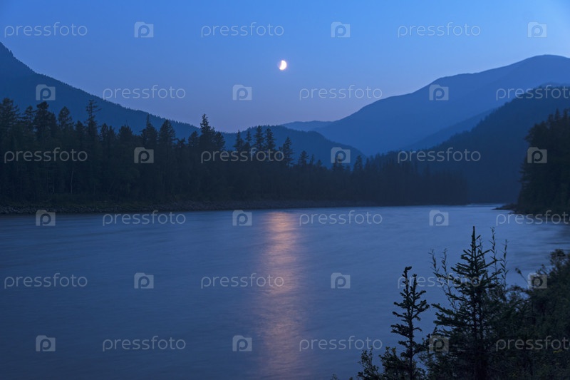 Лунная ночь на реке. Река Ока Саянская в ущелье Орхо-Бом. Восточный Саян, Бурятия, Сибирь, Россия