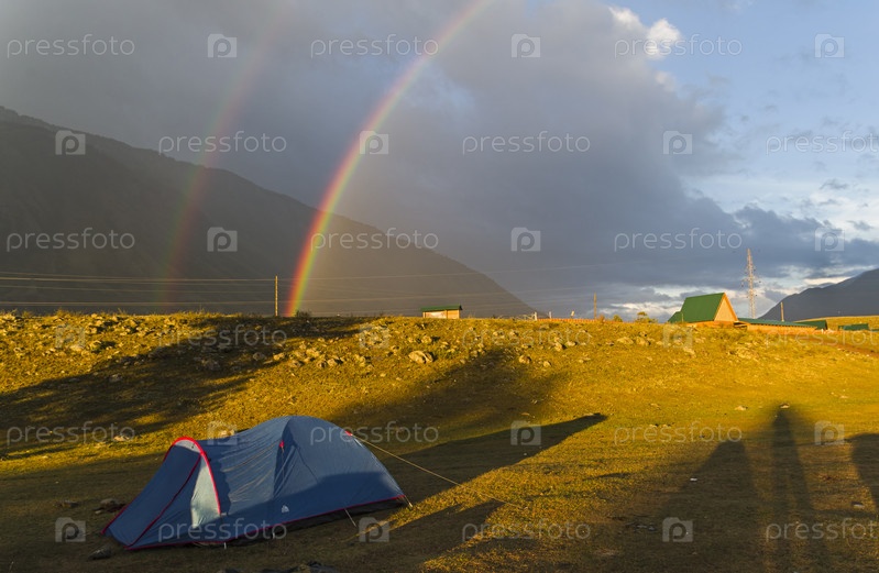 Двойная радуга над туристским лагерем. Горный Алтай, долина реки Чуя, окрестности поселка Чибит. Август