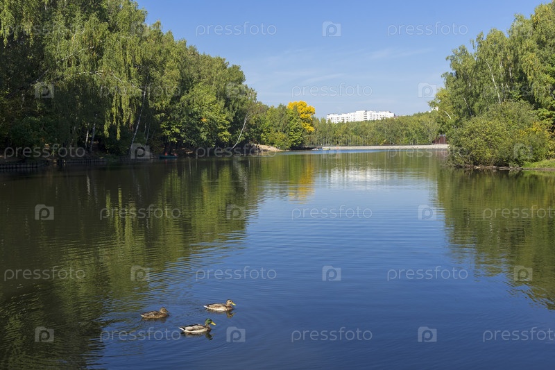 Пруд в ландшафтном заказнике Теплый Стан, Москва, Россия. Солнечный день в сентябре