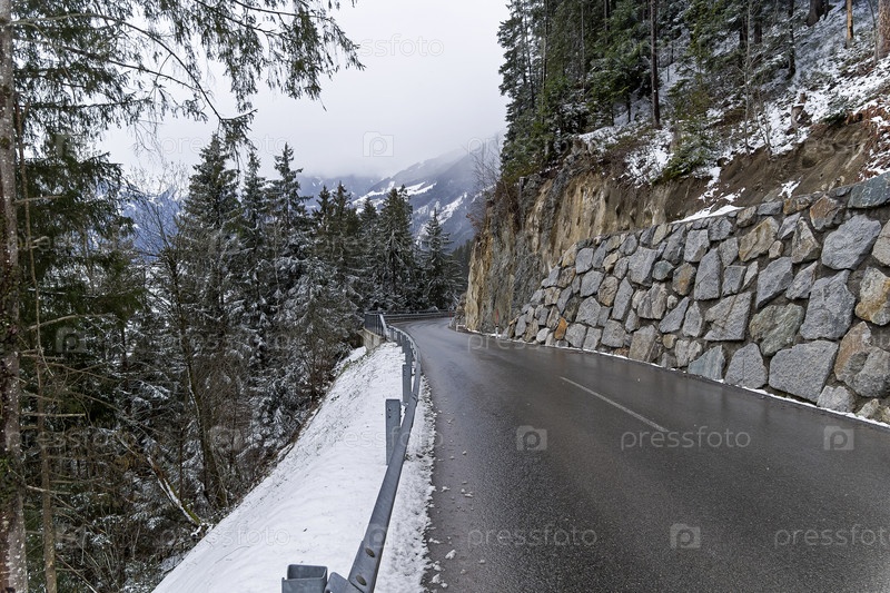 Долина Циллерталь. Вид с горной дороги над поселком Целль-ам-Циллер в сторону горнолыжного курорта Майрхофен. Пасмуреый день в марте