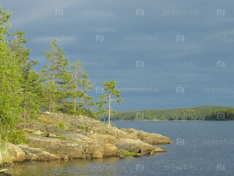 Сосны на прибрежных скалах на фоне темного облачного неба. Белое море. Остров Горелый, Керетская губа, Кандалакшкий залив, Карелия. Солнечный день в августе
