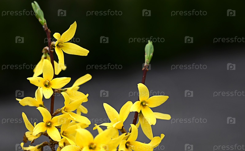 Макро фото цветков форзиции. Желтая цветущая текстура на черном фоне, цветущая форзиция с избирательным фокусом