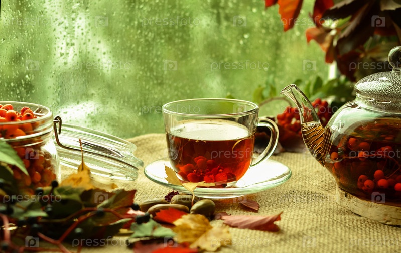 Чайник с облепиховым чаем на подоконнике в дождливый день