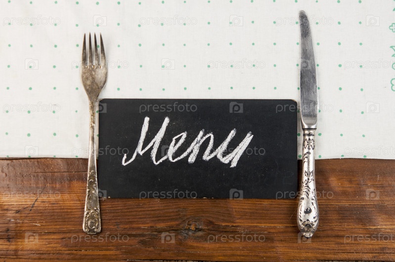 Меню написано мелом на старой доске с кухонной утварью на деревянном столе