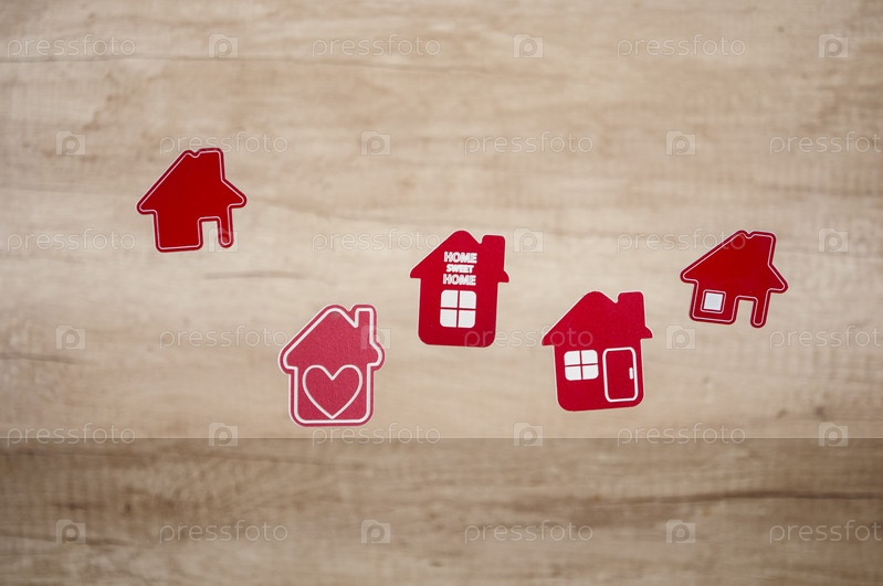 Летающие в воздухе миниатюрные домики на фоне деревянной стены