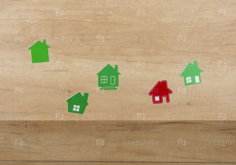 Летающие в воздухе миниатюрные домики на фоне деревянной стены