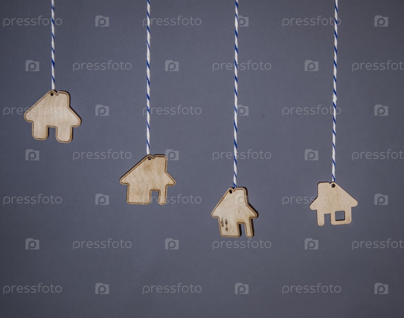Миниатюрные дома висят на веревочках на фоне серой бумаги. Недвижимость, концепция страхования, ипотека, покупка дома, концепция риэлтора