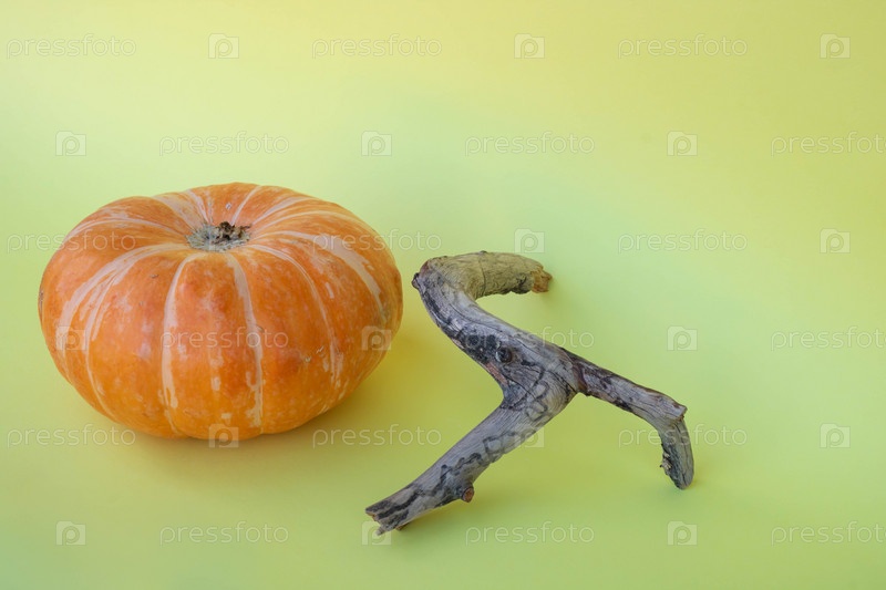 Оранжевая тыква и маленькая коряга лежат изолированно на желтом фоне