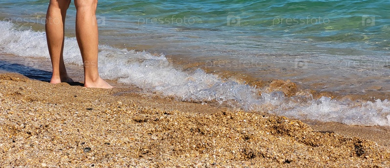 Загорелые ноги в морских волнах на пляже. Концепция отдыха. Место для вашего текста