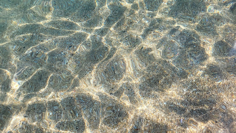 Морское песчаное дно видно сквозь прозрачную бирюзовую морскую воду. Солнечные блики на поверхности моря. Красивый абстрактный фон. Скопируйте пространство. Выборочный фокус