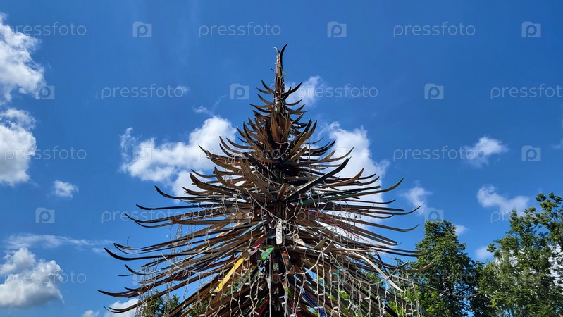 Рождественская елка из лыж в летнем парке на фоне голубого неба