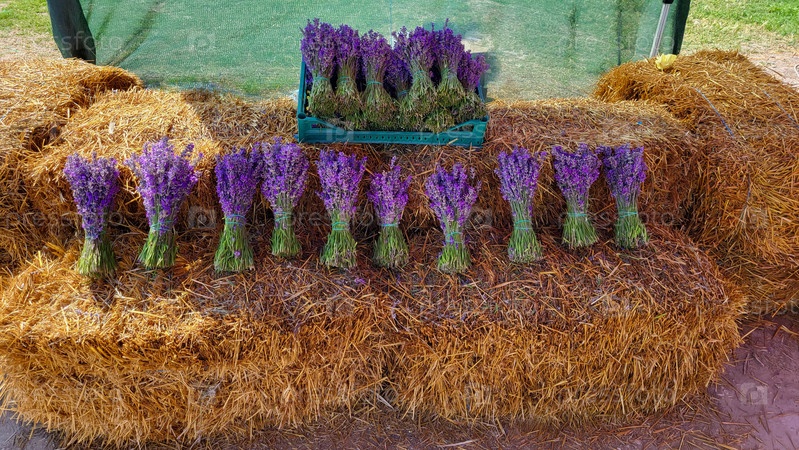 Букеты свежих цветов лаванды лежат на тюках соломы. Ароматные цветы, незаменимый ингредиент в ароматерапевтической косметологии