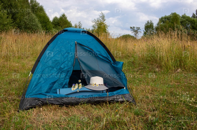 Туристическая палатка стоит на поляне. Понятия о путешествиях и приключениях. Фон природы