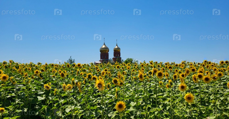 Православная церковь с золотыми куполами посреди поля с подсолнухами