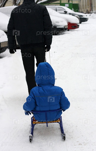 Мужчина несет санки ребенка