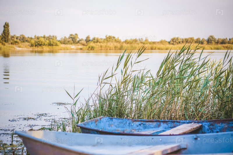 Старая железная лодка у реки. Камыши на реке под солнцем. летний пейзаж с лодками