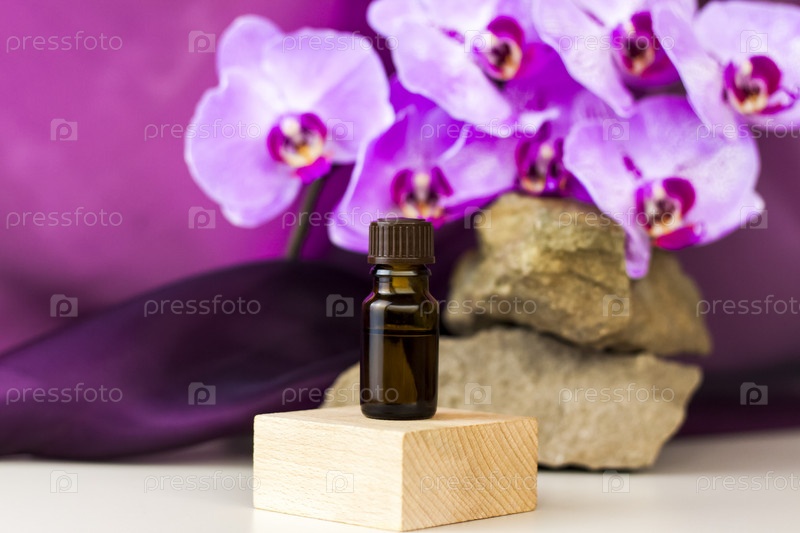 Бутылка косметического масла стоит на деревянном постаменте на фоне камня и красивых орхидей. Стильный внешний вид продукта, макет, индивидуальность. Баннер, место для текста