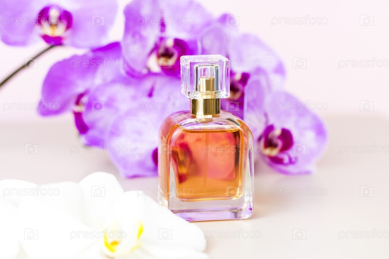 Флакон духов на розовом фоне вокруг красивых цветов орхидеи. Стильный внешний вид, планировка, индивидуальность. Баннер, место для текста
