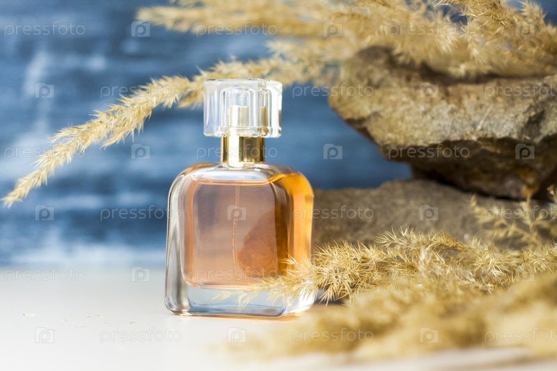 Флакон духов на фоне пампасной травы на цветном фоне и камень. пушистая веточка. Стильный внешний вид, планировка, индивидуальность. Баннер, место для текста